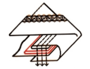 - kääntää noin 35mm leveän nauhan kolminkerroin kankaan reunan ympärille. (2-kertainen kankaan päälle, 1-kertainen alle)