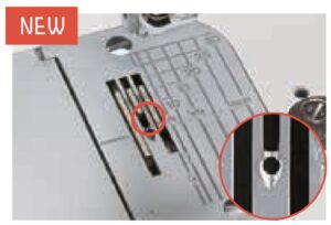 Pistolevyssä on suurempi neulanreikä ja syvemmät langankevennysurat. Nämä ominaisuudet auttavat estämään ompeluvirheitä ja tuottavat kireät saumat, kun käytetään paksua materiaalia ja lankaa.