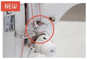Vaikka käyttäisit runsaasti kierrettyä lankaa, esikiristin tasaa ”kierteen takaisinpaluuta” ja syöttää ylälangan langankiristimelle ilman ”värinää”, taaten tasaiset tikit vakaalla langankireydellä.